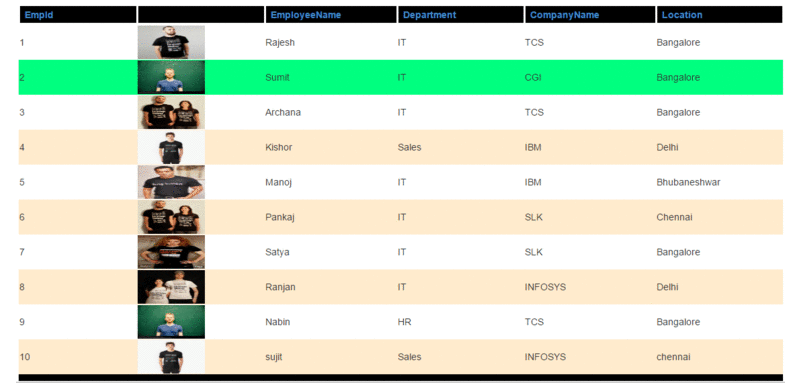 Thus, in this way, we can bind the image in the WebGrid and can change the backgroung color of the Webgrid row on which we hover the mouse. I hope this tutorial will help you to understand this for the initial stage.