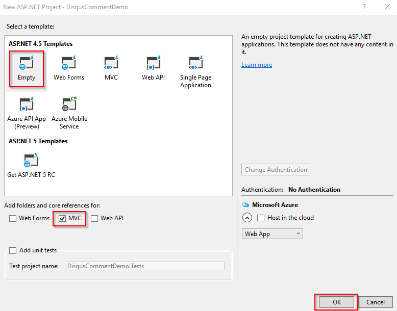 A new ASP.NET project window will open, you can select an empty template and select an MVC folder with no authentication and then click OK button.