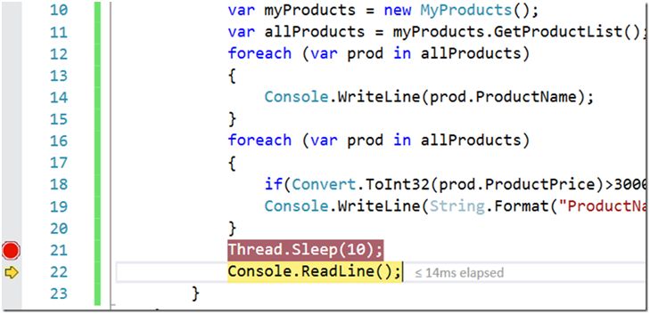 You can see the PerfTips appeared saying time elapsed is less than 1 millisecond. We did not used any stopwatch or code or any third party tool to get this time elapsed. It is the new perfTips feature of Visual Studio 2015 that shows the time elapsed during program execution till this breakpoint. Now if I again run the application but with one change. I have put Thread.Sleep for 10 milliseconds after both the foreach loops and place the breakpoint there. Now when you run the application and step over the Thread.Sleep(10) breakpoint, the PerfTips feature will add that elapsed 10 millisecond too while displaying the time elapsed in previous step.