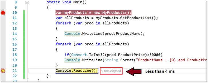 It clearly says the time elapsed until previous step was less than or equal to 14 milliseconds. You can also get the time elapsed between two breakpoints. Let’s try to do that. Let’s put the first breakpoint at the start of the method and another at last line of the method. Now when you run the application the code execution stops at first breakpoint. Simply press F5 or continue with the execution, the execution will halt at second breakpoint, therefore showing the total time elapsed for complete method to execute.