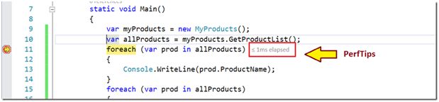 In the earlier part of the series we covered topics like breakpoint configuration improvements and new improved error list, tool window support for lambda and LINQ queries in Visual Studio 2015.This article will cover another debugging improvement of Visual Studio 2015 i.e. new PerfTips feature.