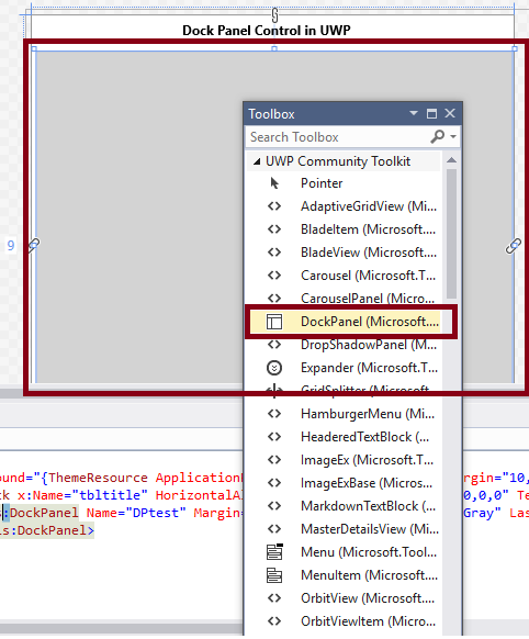 DockPanel Control is from UWP Community Toolkit. The UWP Community Toolkit is a collection of helper functions, custom controls, and app services and it simplifies and demonstrates common developer tasks building UWP apps for Windows 10.