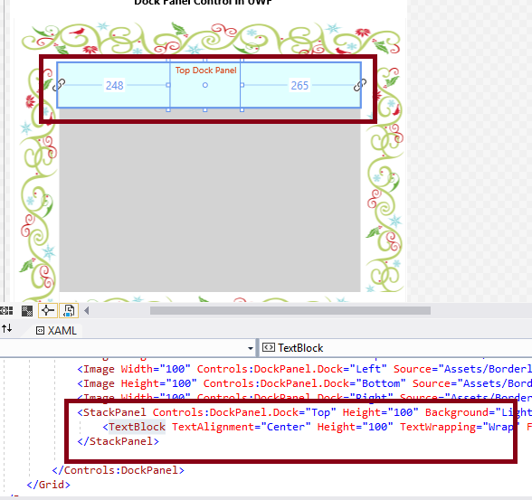 Add the following controls in design window for DockPanel control view. Add the TextBlock and change the name and text properties.