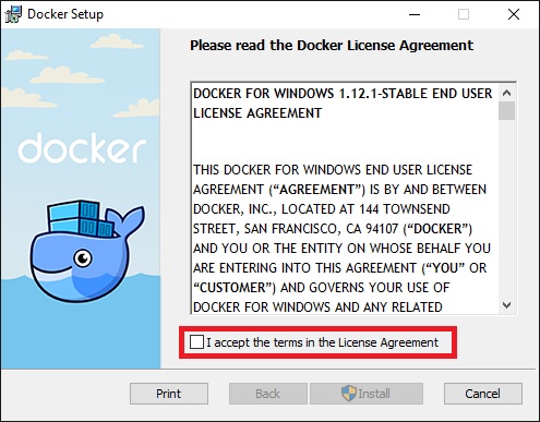 Next, follow the installation wizard to install the Docker for Windows. Then, click "I accept license term" and start an installation process.
