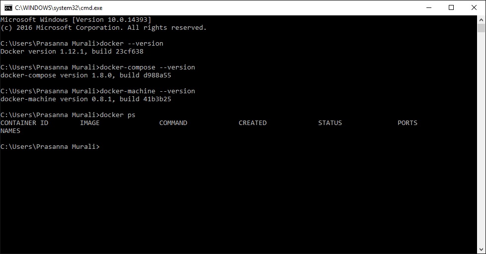 Start your Shell [cmd.exe] to check the version of Docker and docker-compose, and verify the installation