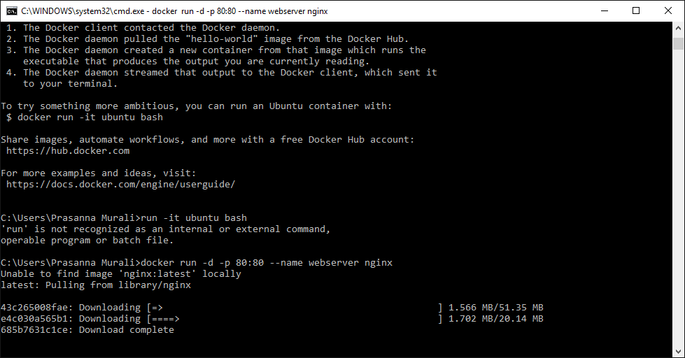 Start Docker on Windows manually or it will start automatically if installation completes successfully. You get a toast notification as Docker is running with a whale icon on it and you are able to access terminal. If you installed Docker for the first time, you also get a Docker tour or documentation, as shown below.