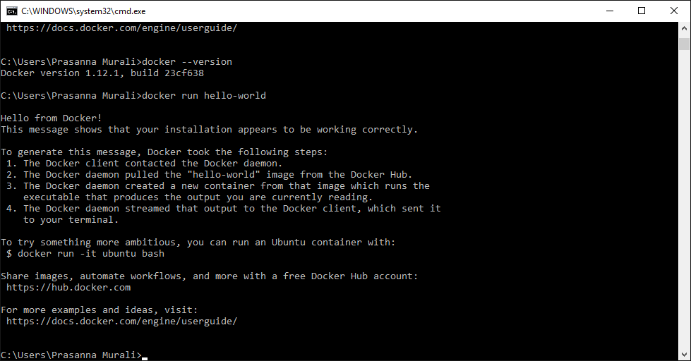 In this article, we’ve learned the basics on setting up Docker on the Windows environment and learned how to create a simple hello world application using Docker web service.