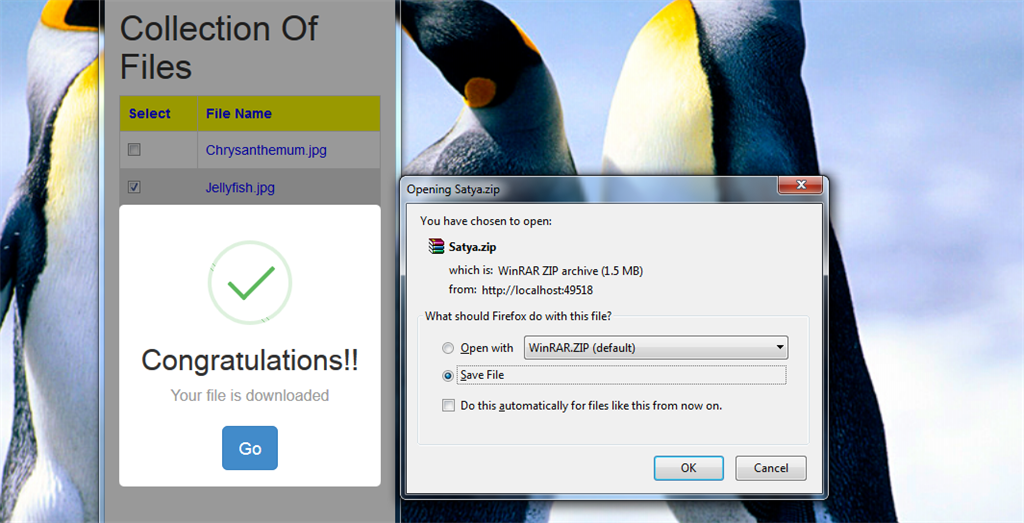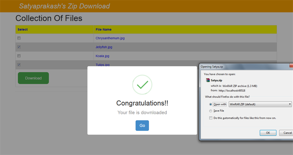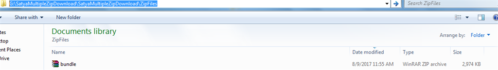 The zip file is downloaded with name "Satya.zip" inside ProcessForm action result method. But the file name will be found with name bundle.zip inside zipfiles folder.