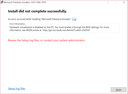 The HoloLens Emulator needs the Virtualization enabled on your PC. If you're getting the following error, you must enable Virtualization on your PC by going to BIOS and find processor virtualization settings and Enable it.