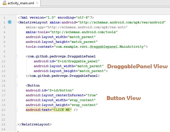 Next, go to app >> res >> layout >> activity_main.xml. Select activity page. The XML code will appear, Just the following code. Create the layout of the Button and draggable panel.