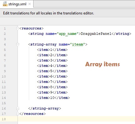 Next, go to app >> res >> values >> string.xml. Select string page. The XML code will appear, Just the following code or add string - array items. Create the layout of the "array - items" 1 - 10.