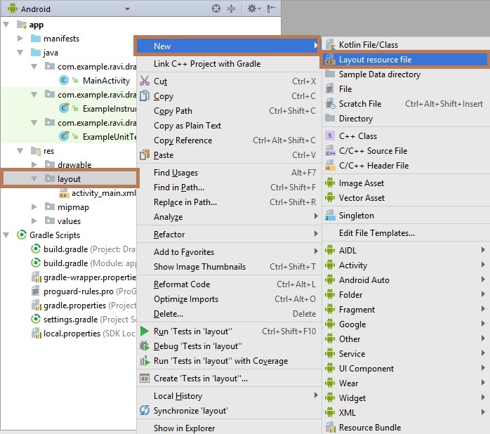 Next, go to app >> res >> layout right click to add New >> Layout Resource File.