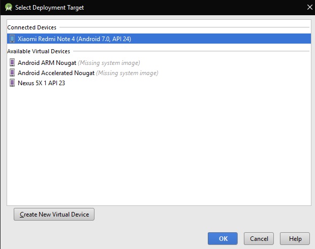 Next, go to Android Studio and deploy the application, Select Emulator or your Android mobile with USB debugging enabled. Give it a few seconds to make installations and set permissions.