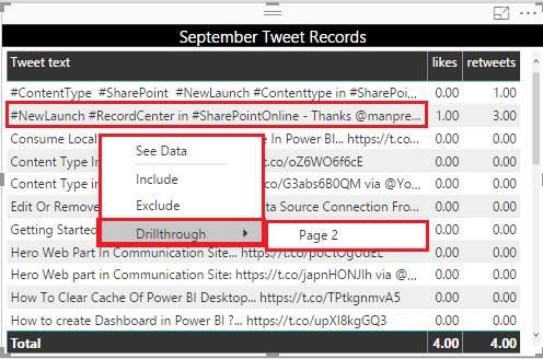 Suppose I have a Twitter analytics report and when I right click on Twitter text or likes or retweets it should redirect me to my page 2 report.