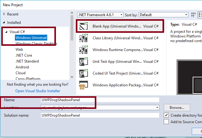 Open Visual studio 2017. Go to Start -> New Project-> select Windows Universal (under Visual C#) -> Blank App (Universal Windows) -> Give a suitable name for your App (UWPDropShadowPanel) -> OK.