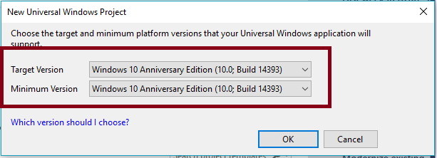 After choosing the target and minimum platform version that your Windows Universal Application will support (Windows Anniversary Update (10.0.14393.0)), the project creates App.xaml and MainPage.xaml.