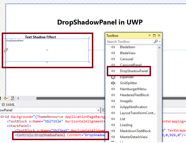 Add the TextBlock Control and change the name and text property. Add an image to Assets for DropShadowPanel control Image Effect.