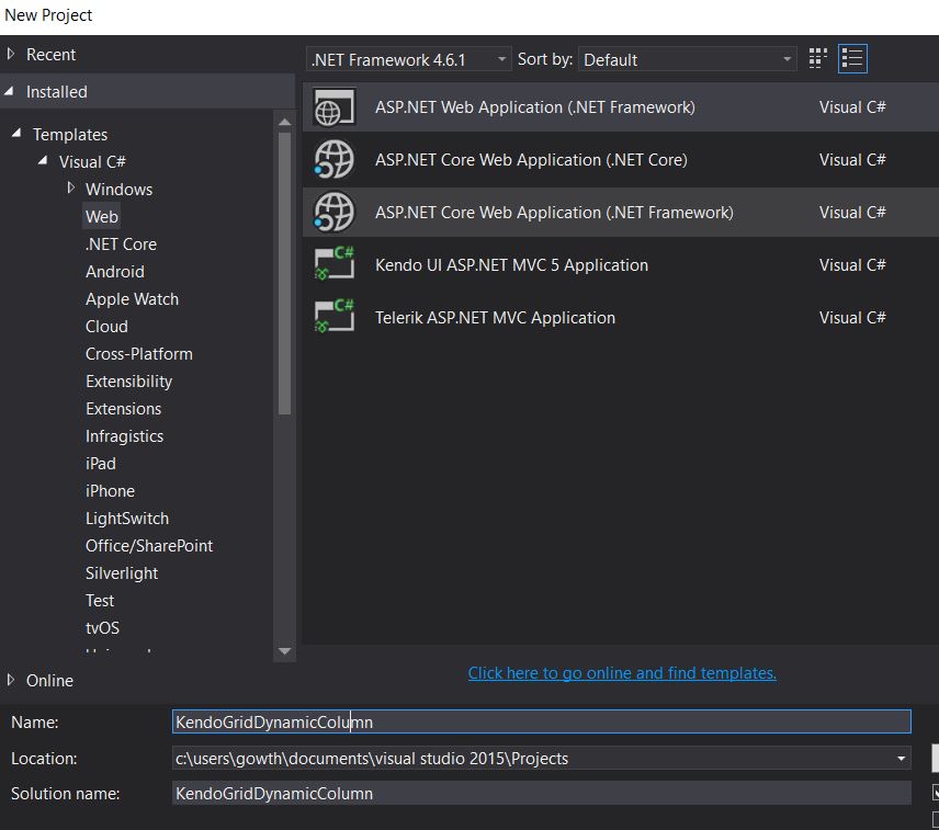 Create a Web API Application, using an installed Web template in Visual Studio, as shown below. In my case, I named the Application “KendoGridDynamicColumn".