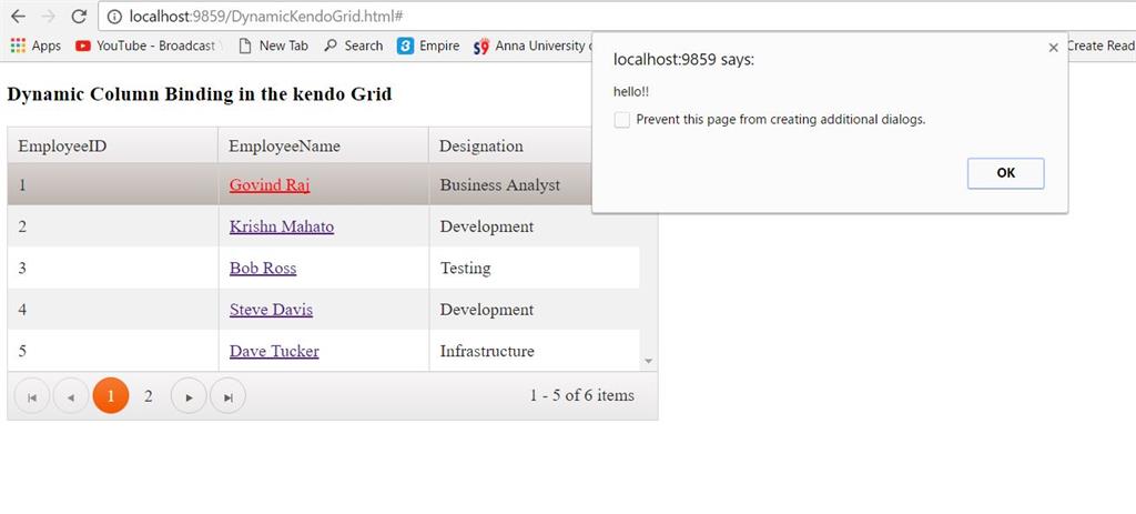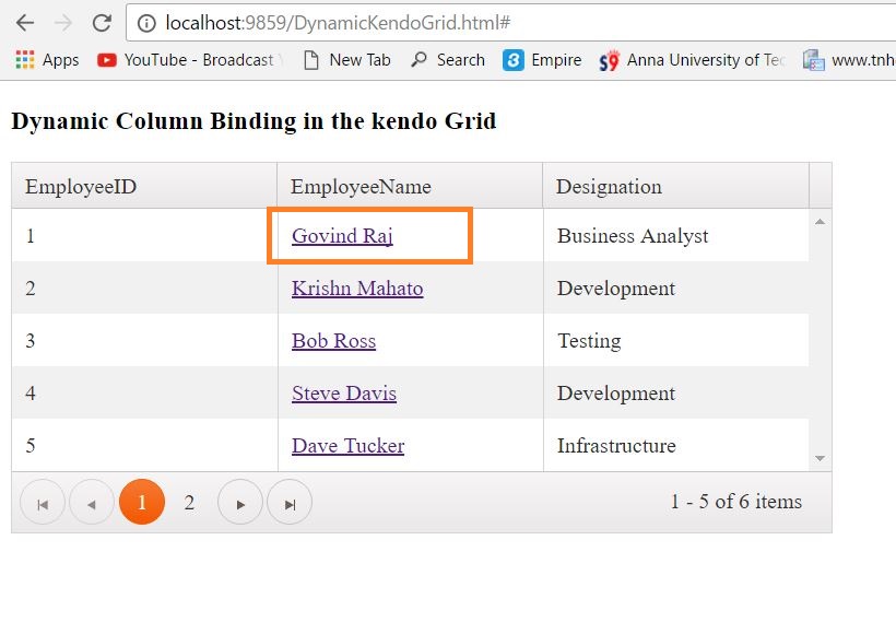 This ColumnGeneration function is used to customize the dynamic column, where you can notice from the code, mentioned above, where I have created a template for the EmployeeName field to make it as a link.