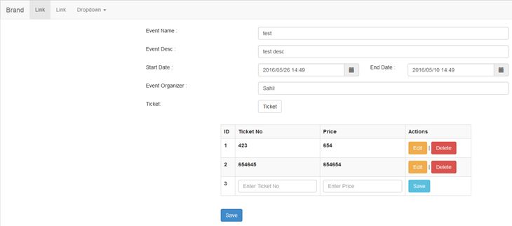 - SaveTicket function save the current row in which the click event is fired and adds the edit and delete button in the row inplace of save.