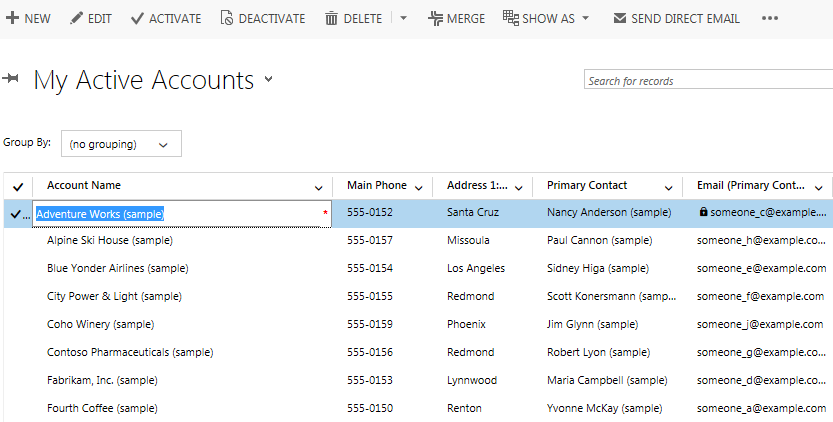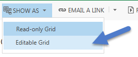 - Navigate to Sales-> Accounts and click on Editable Grid under SHOW AS button on the command bar. (You will be able to see this button only after adding Editable Grid under controls).