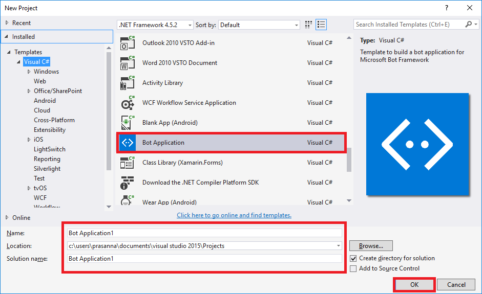 Click New >> Visual C# >> Bot Application. Then, provide the name of the application and click Create button. It takes some time to create an application.