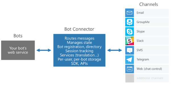 Bot connector acts as a mediator between bots and channels. Bots are infrastructure services . This service provides a connection between various channels, such as Skype, Email, GroupMe, Slack etc. Here, we are going to develop an application using Visual Studio in C# project template. So, we are familiar with C#. Then, it is going to be very easy. This developed application is hosted by using Microsoft Azure web app.