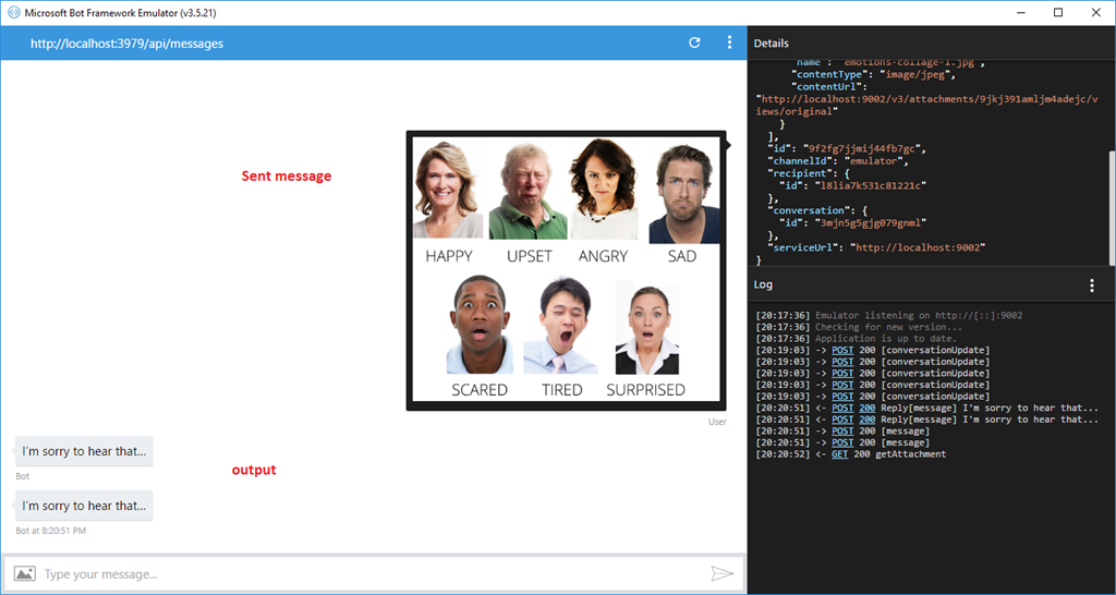 Here, we are developing an application for displaying an emotion using Cognitive Emotion API. It displays output using Bot framework.