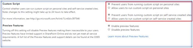 In SharePoint Online, by default, some of the features are turned off. Features like Save Site as a template, ability to add JS Link and other script-related featured are turned off due to security reasons. If we go to SharePoint online admin center we can allow Custom Scripts on sites which will activate the missing features. In order to do this go to SharePoint Admin Centre ->Settings.Select 'Allow Users to run custom script’ radio buttons. However, selecting allow custom script won’t be enabled until the timer job runs which will happen as per SharePoint Online settings which is something we can’t control . Hence a time period of 24 hours will be required for this to take effect. If we can’t wait that long we can get this activated using PowerShell for SharePoint Online. In order to execute PowerShell commands against SharePoint online, first we have to establish a connection with SharePoint Online. This is done using the command. Connect-SPOService It will ask for the SharePoint Online credentials as shown below. Enter the User name and password to authenticate to SharePoint online. Once the authentication succeeds you will have to enter the admin center url for the “Url“ Parameter as shown above. Once the connection is established, in order to allow custom scripts we can use the below single line cmdlet. Set-SPOsite -DenyAddAndCustomizePages 0. This will enable custom scripts in the site collection and the missing features, like Save list as template, will become available in the UI. Make sure you have set the setting in Admin Center to Allow users to run custom script. If we don’t update this setting, after 24 hours the change made by PowerShell script will be reverted back and custom script will be disabled as the admin center settings supersedes PowerShell update. If we would like to turn off custom script we can use the same cmdlet but with a slight change: We will set the value of DenyAddAndCustomizePages to 1. Set-SPOsite -DenyAddAndCustomizePages 1. Save List as template will again be removed from the UI. Thus we have seen how to enable custom scripts in SharePoint Online using Admin Center as well as PowerShell.