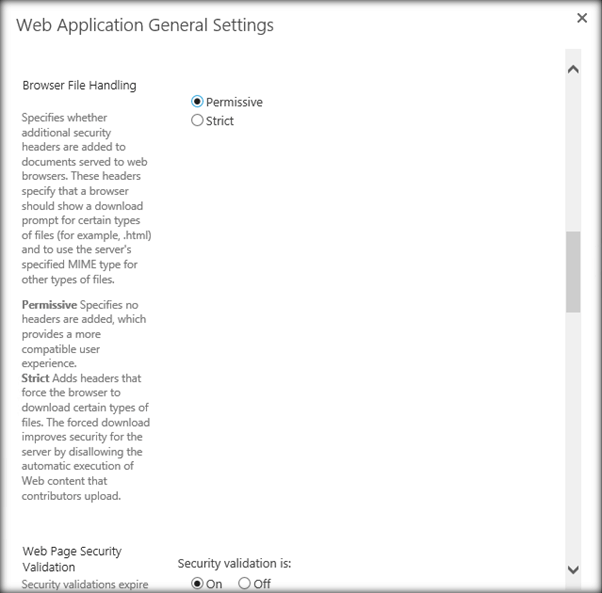 Setting the Permissive option enables PDF to open up in the browser. Though this can be achieved out of the box, it is not recommended to change the Browser file handling from Strict to Permissive, as it opens up a huge security hole in the SharePoint Environment. Setting the option to ‘Strict’ adds ‘X-Download-Options: noopen’ to the header of the document whose MIME (Multipurpose Internet Mail Extensions) type is not present in the web applications’ allowed list. This prevents file from opening in browser.
