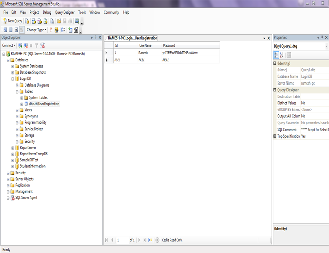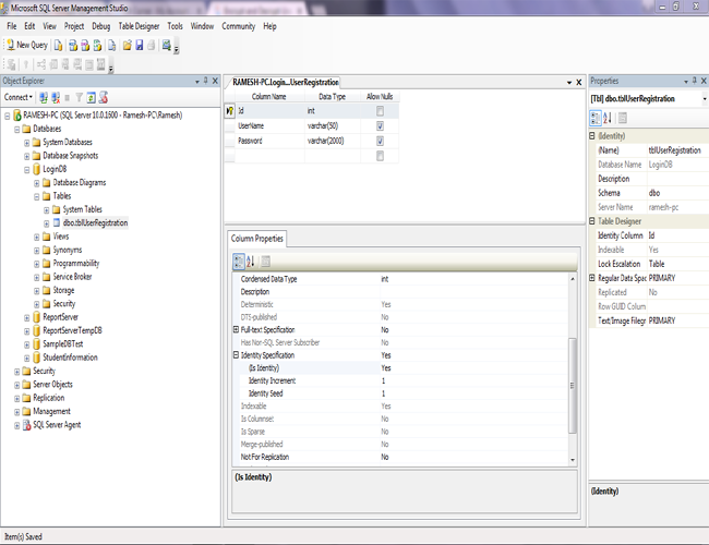 The table "tblUserRegistration" has three columns - Id, UserName, Password. Id is a primary key; set its identification to yes and initialize starting value as1. UserName and Password are string values, so I set these as varchar datatype.