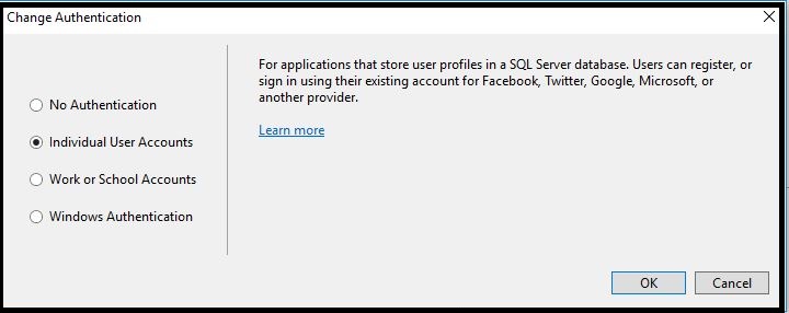 Please note that if you don't select any authentication, "No Authentication" will be selected by default, and there we will not get all the Identity related options. So, make sure you select the Individual Accounts while working on it.