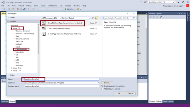 Open Visual studio 2017 RC -> Start -> New Project-> Select Cross-Platform (under Visual C#->Cross Platform App) >> Give a suitable name to your App (XamFormEntryCell) ->OK.