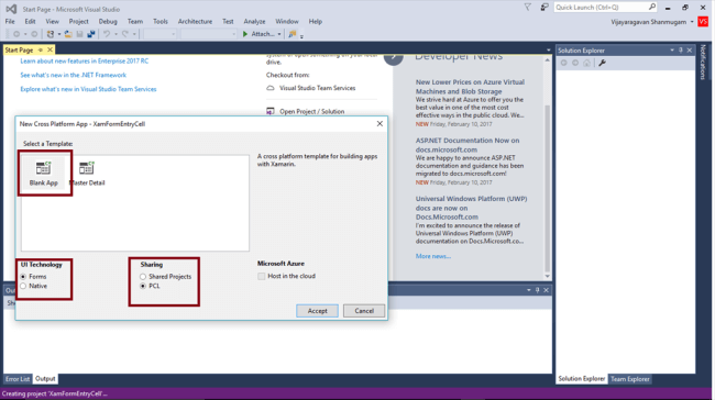 Select the Cross Platform template as Blank APP ->Set UI Technology as Forms and Sharing as PCL. Afterwards, Visual Studio creates 4 projects (Portable, Droid, iOS, UWP) and displays Getting Started.XamarinPage