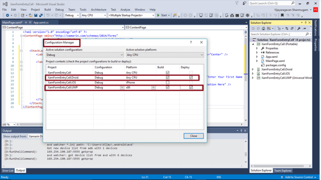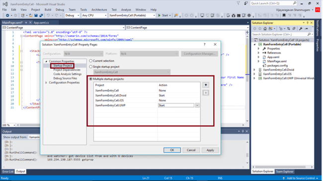 We will test Android and UWP. So, we can set the Multiple Startup Projects as XamFormEntryCell.Droid and XamFormEntryCell.UWP (Universal Windows).