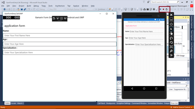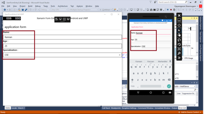 Deploy your app to Android Emulator and Local Machine (UWP). The output of the XamFormEntryCell App is given below.