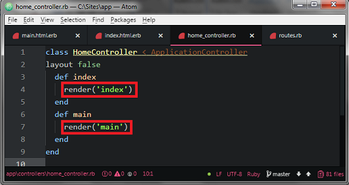 After completing the file creation now we have to configure the files in our home controller, The 'home_controller.rb' file is stored in our app>>controller folder and now we add rendering codes like in the following picture. This shows code for each page for rendering when the page requests to render it.