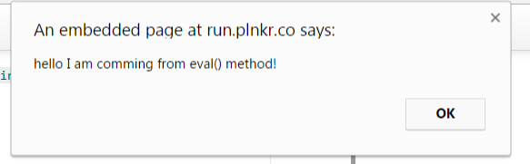 Here, I have put method "alert()" with some string inside eval() method as a string. eval() method evaluates it and generates JavaScript dynamic code alert() with value. Alert box will appear after the execution of the code like below.
