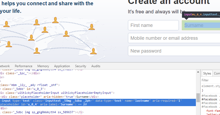 In order to automate its controls like firstname , surname , mobile name, email address, new password, & so on from Register page of Facebook application, we use various control properties like its Control id, control name, XPath, className, cssSelector, Tagname etc.