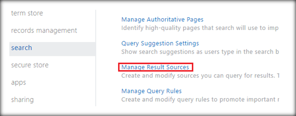 In SharePoint Online, we can create or manage the existing result sources from the Admin Center by selecting the Manage Result Sources option from the search tab. By default, SharePoint provides 16 out of the box result sources for use with Search.