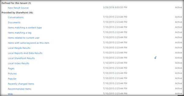 Initially, Local SharePoint Results are used as the default result source. Changing it to our newly created result source, a tick mark will come up against the new result source.