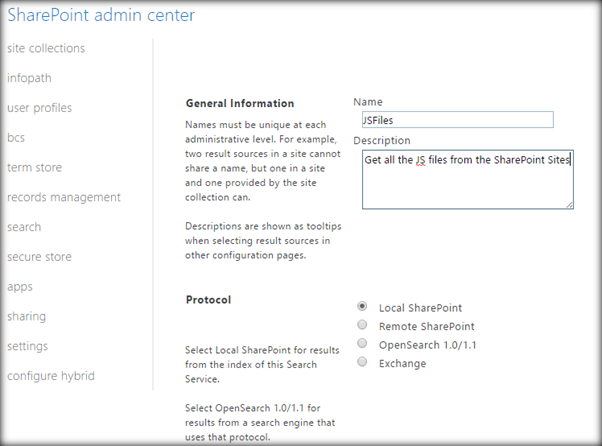 The result source in SharePoint specifies the location from which SharePoint search fetches the results. Result source can also be used to specify the protocol used to fetch the results. In addition to all these, we can specify further filter condition by specifying query in the query builder. SharePoint 2010 had Search Scopes which have been deprecated from SharePoint 2013 onward. To bring in more functionality on top of result scope, result sources were introduced in SharePoint 2013.