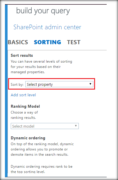 In the sorting tab, we have the option to sort the search results by a specific metadata property.