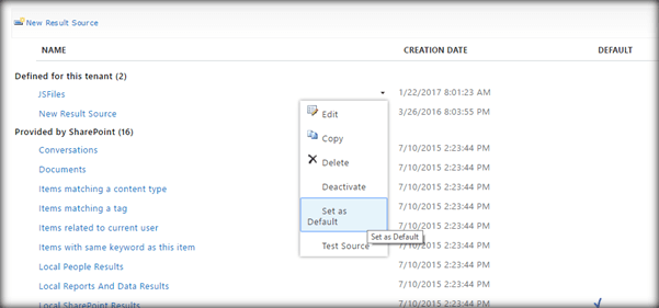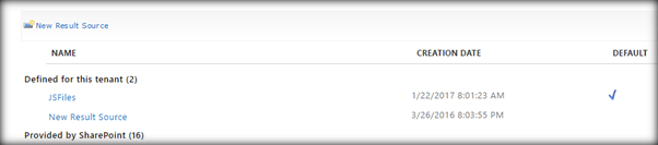 Clicking on "Save" will create the Result Source. Heading back to the Result Sources page, we can see that in addition to the 16 Result Sources provided by SharePoint the newly created Result Source has also been listed out. We also have the option to set it as the default Result Source.