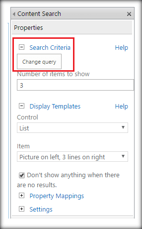 Clicking on Edit Web part will show the web part properties. Click on Change query to go the Content Search Web Part settings page.
