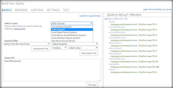 In the “Select a query” section we can see that the new result source, JSFiles, has come up in the drop down and has been selected as the default result source.