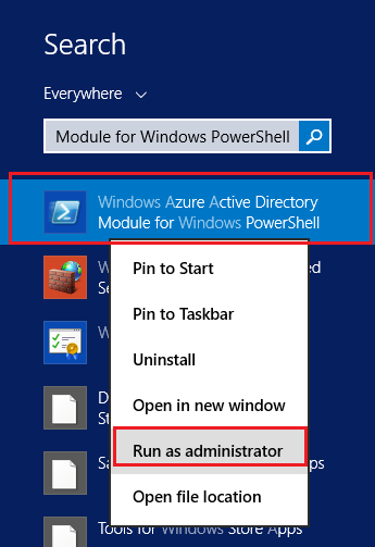 Right-click on Windows Azure Active Directory Module for Windows PowerShell > Run as Administrator.