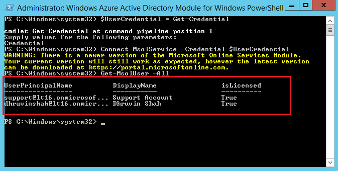 The below screenshot shows Windows Azure Active Directory Module for Windows PowerShell.