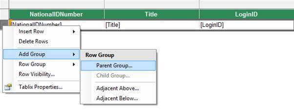 Open RDLC and select the data row of the table. Right-click on it, select Add Group and then select Parent Group.