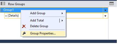 In the next step, at the bottom of the RDLC report, you will find “Row Groups” pane. Here, right-click on the group name and select Group Properties.
